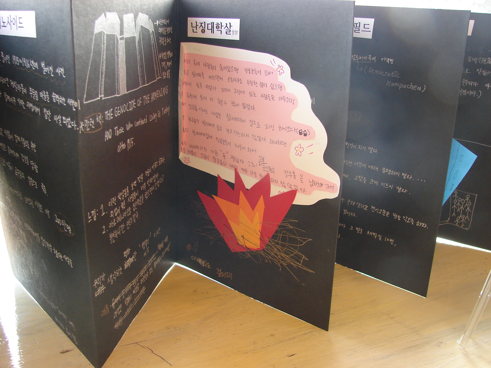 1박2일의 여정 부산에서 파주끝까지 긴 여행 8월22일 오후 7시가 넘어 도착한 평품집에서 재미있는 미션을 수행했습니다, 이 곳이 어떤곳, 어떤일을 하는곳인지 알려주기 전에 스스로 알아보는 시간을 가졌습니다. 각자의 미션지를 받아들고 각자 흩어져 보고, 조사하고, 책을 찾아 읽어보는 시간을 가진후.. 발표하는 시간을 가져봅니다. 평품집과 제노사이드란? 아르메니아 제노사이드, 난징대학살, 홀로코스트, 캄보디아 킬링필드, 르완다, 오키나와의 학살에 대히 꼼꼼히 알아보는 시간을 가진후, 이제 친구들에게 발표하는 시간을 갖었습니다. 진중하게 듣는 친구들의 모습에서 진지함이 묻어났습니다. 서로 조사한 내용을 발표함으로써 내 눈높이에서 알아볼수 있는 소중한 시간이었습니다. 밤새 무슨일이 있었는지는 모르나 다음날 아침에 만나보니 모두 잠을 못잔듯한 모습이었습니다. 오전시간은 박채란 작가와의 만남시간이었습니다. 선생님 작품 '콕요일 싸이프러스에서' 책 이야기를 듣고 작가와의 시간을 갖었습니다. 책에 등장하는 많은 식물이야기, 그 식물과 닯아있는 우리들의 이야기.. 또 작가라는 직업에 관련한 다양한 질문들... 모두모두 소증한 시간이었습니다. 아쉬움을 뒤로한체 부산으로 떠나는 아이들. 다시 만날날을 기약하며... 안뇽...