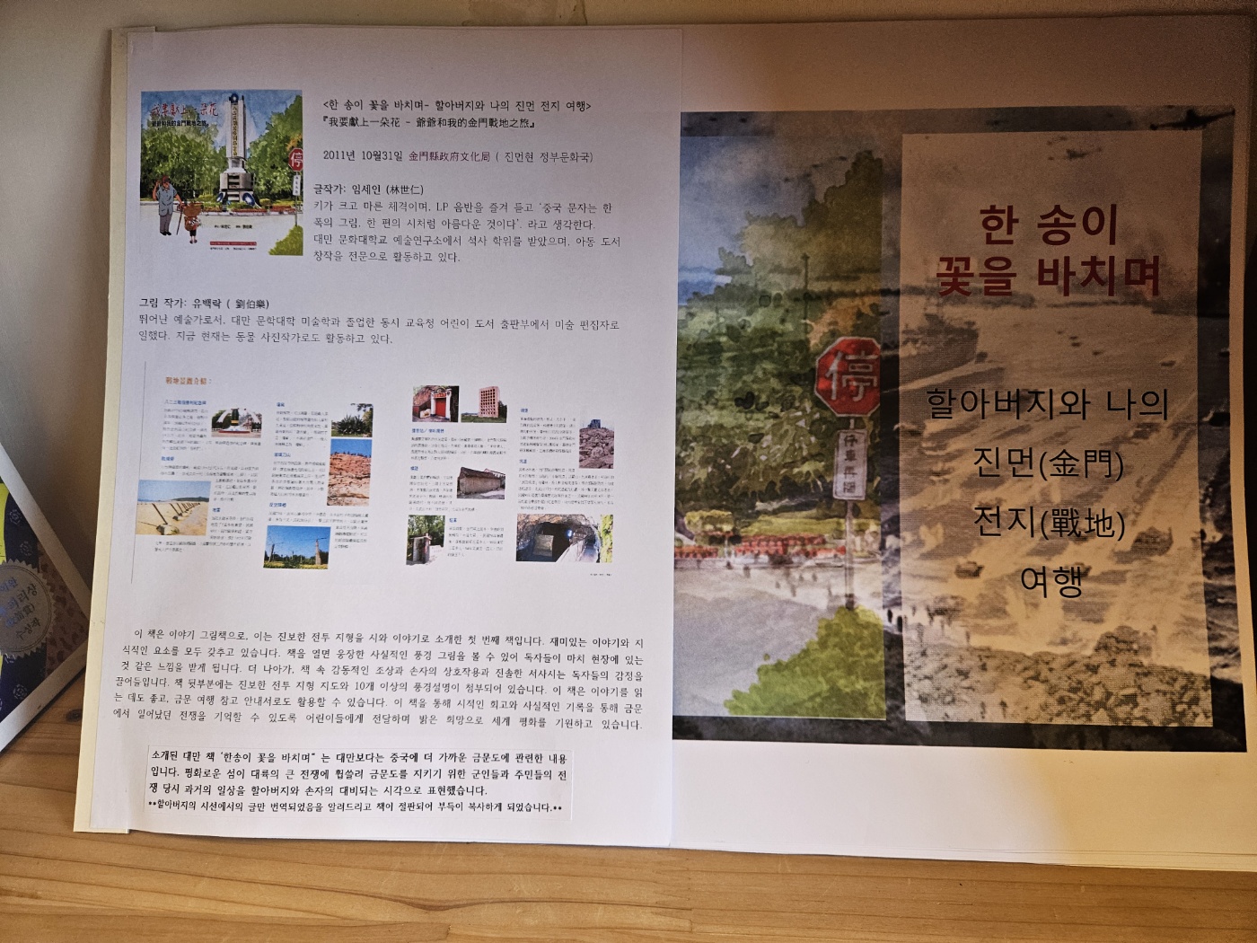 이번에 소개된 대만 책 ‘한송이 꽃을 바치며“ 는 대만보다는 중국에 더 가까운 금문도에 관련한 내용입니다. 평화로운 섬이 대륙의 큰 전쟁에 휩쓸려 금문도를 지키기 위한 군인들과 주민들의 전쟁 당시 과거의 일상을 할아버지와 손자의 대비되는 시각으로 표현했습니다.