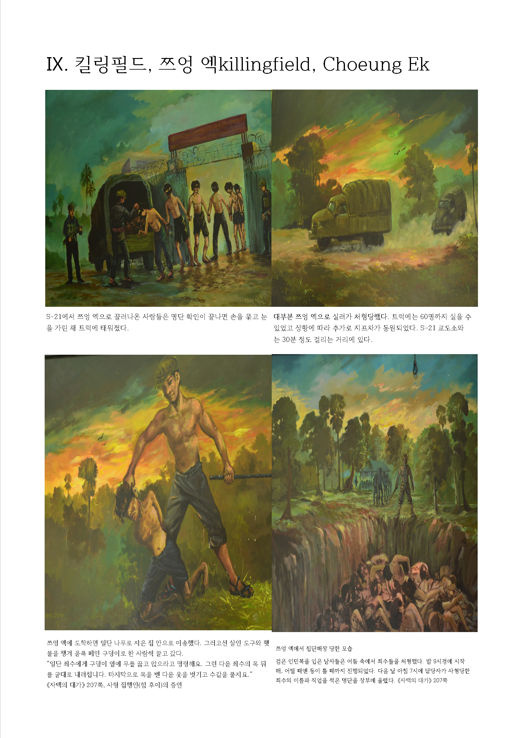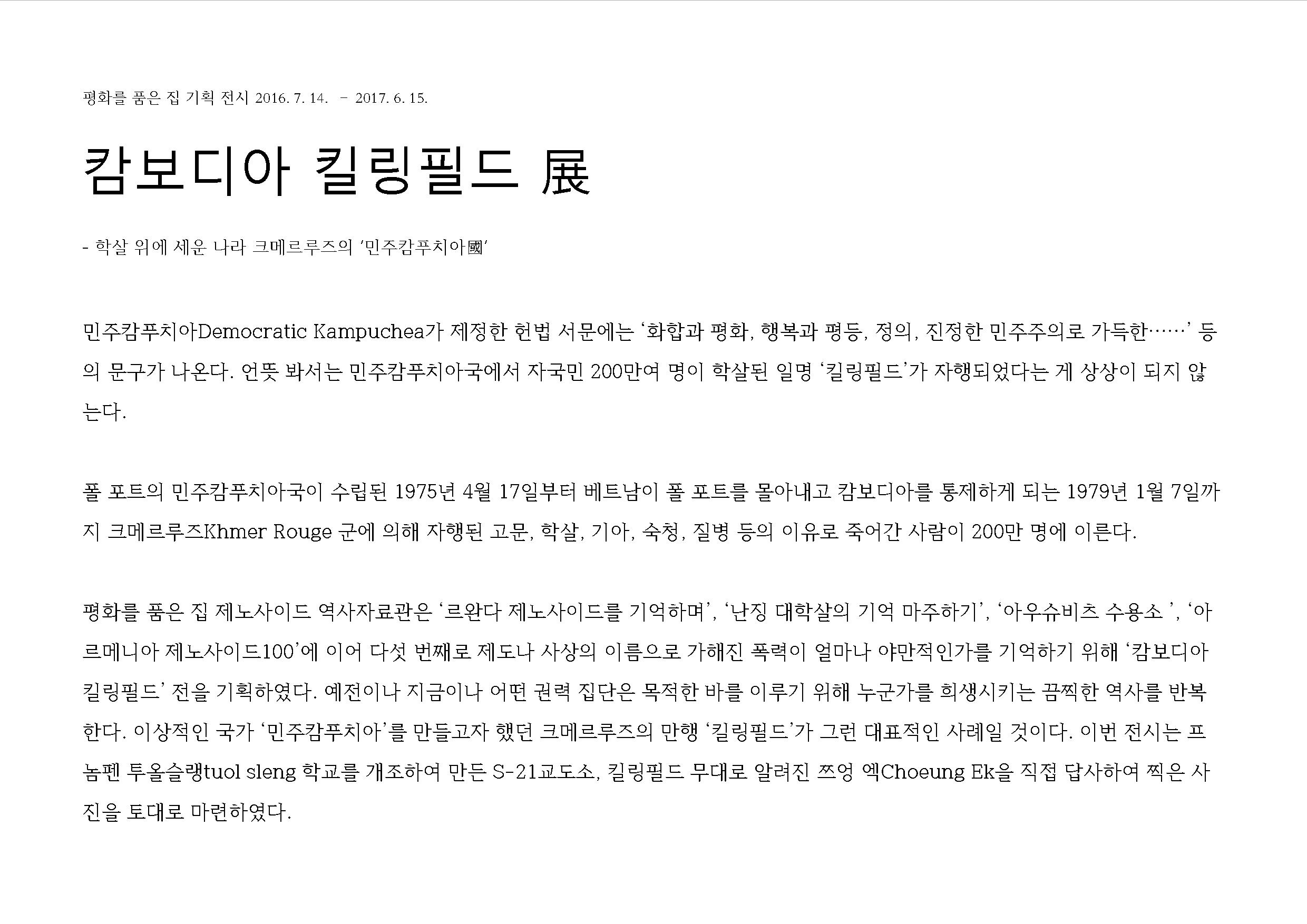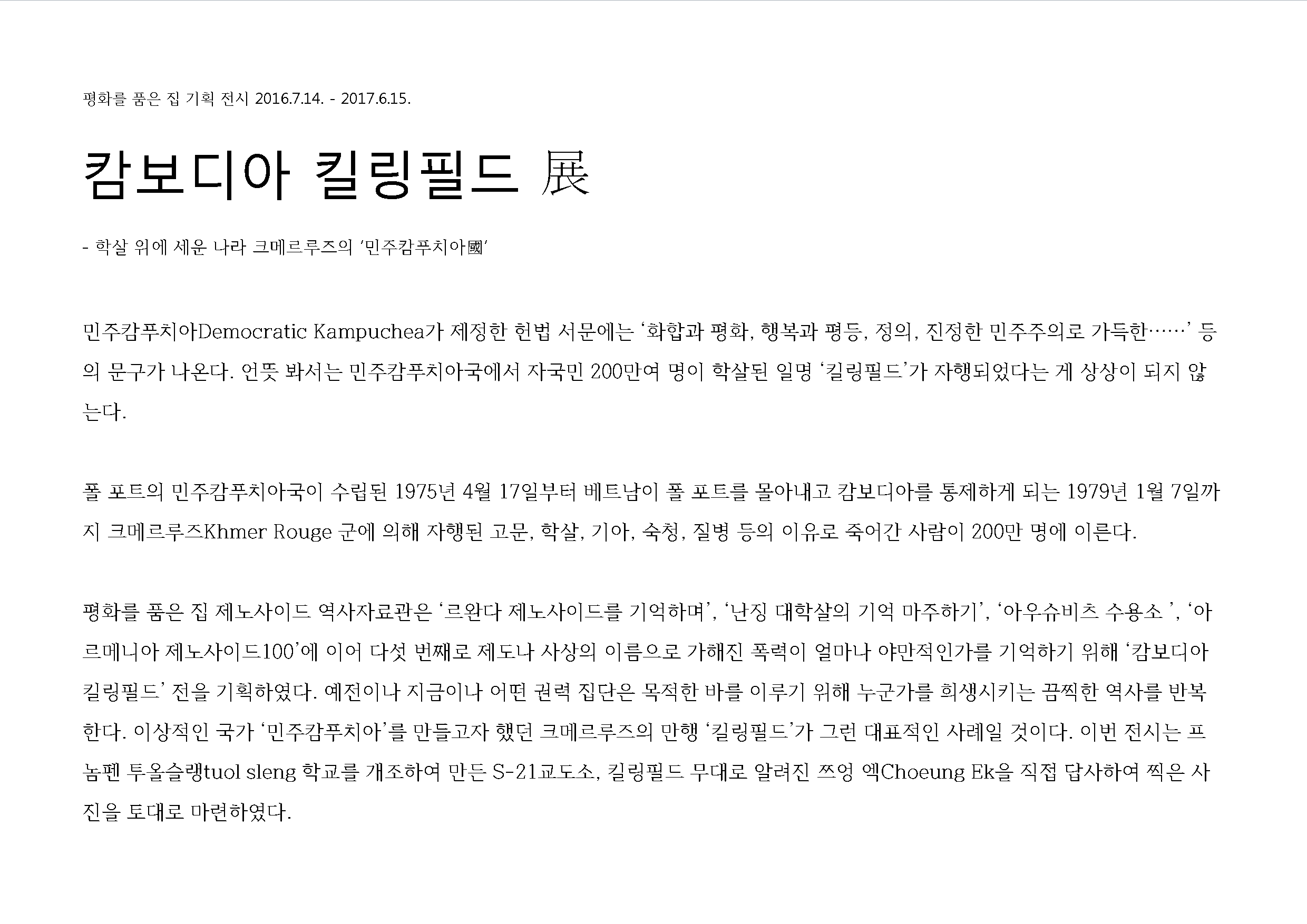 평화를 품은 집 제노사이드 역사자료관은 ‘르완다 제노사이드를 기억하며’, ‘난징 대학살의 기억 마주하기’, ‘아우슈비츠 수용소 ’, ‘아르메니아 제노사이드100’에 이어 다섯 번째로 제도나 사상의 이름으로 가해진 폭력이 얼마나 야만적인가를 기억하기 위해 ‘캄보디아 킬링필드’ 전을 기획하였다. 예전이나 지금이나 어떤 권력 집단은 목적한 바를 이루기 위해 누군가를 희생시키는 끔찍한 역사를 반복한다. 이상적인 국가 ‘민주캄푸치아’를 만들고자 했던 크메르루즈의 만행 ‘킬링필드’가 그런 대표적인 사례일 것이다. 이번 전시는 프놈펜 투올슬랭tuol sleng 학교를 개조하여 만든 S-21교도소, 킬링필드 무대로 알려진 쯔엉 엑Choeung Ek을 직접 답사하여 찍은 사진을 토대로 마련하였다.