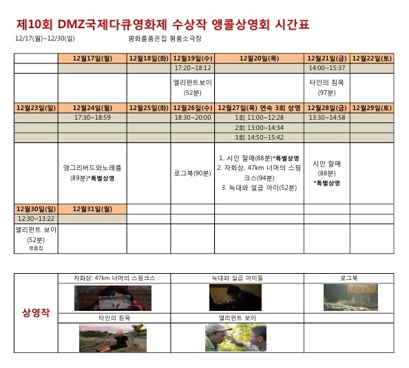 제10회 DMZ국제다큐영화제 수상작을 감상하며 즐겁고 유익한 시간이 되시기를 빕니다. (아래 상영 시간표를 참고하세요. 수상작 중 일부 영화는 사정상 상영 시간표에서 빠졌음을 양해 바랍니다.)