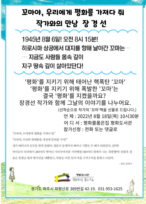 꼬마야, 우리에게 평화를 가져다 줘 장경선 작가와의 만남2022년 8월 18일(목) 10시 30분 평화를품은집에서 진행됩니다. 1945년 8월 히로시마로 날아간 핵폭탄 '꼬마'를 주인공으로 한 그림책입니다. 이 책이 만들어지까지의 다양한 이야기를 장경선 작가와 함께 나누는 시간을 가져보세요.(그리고 숨어 있는 초대까지... 누구일지는 당일에 참석해야만 알 수 있답니다.^^) 당일 원활한 행사 진행을 위해 참석 신청은 댓글이나 도서관 전화(031-953-1625)로 해주세요^^ |