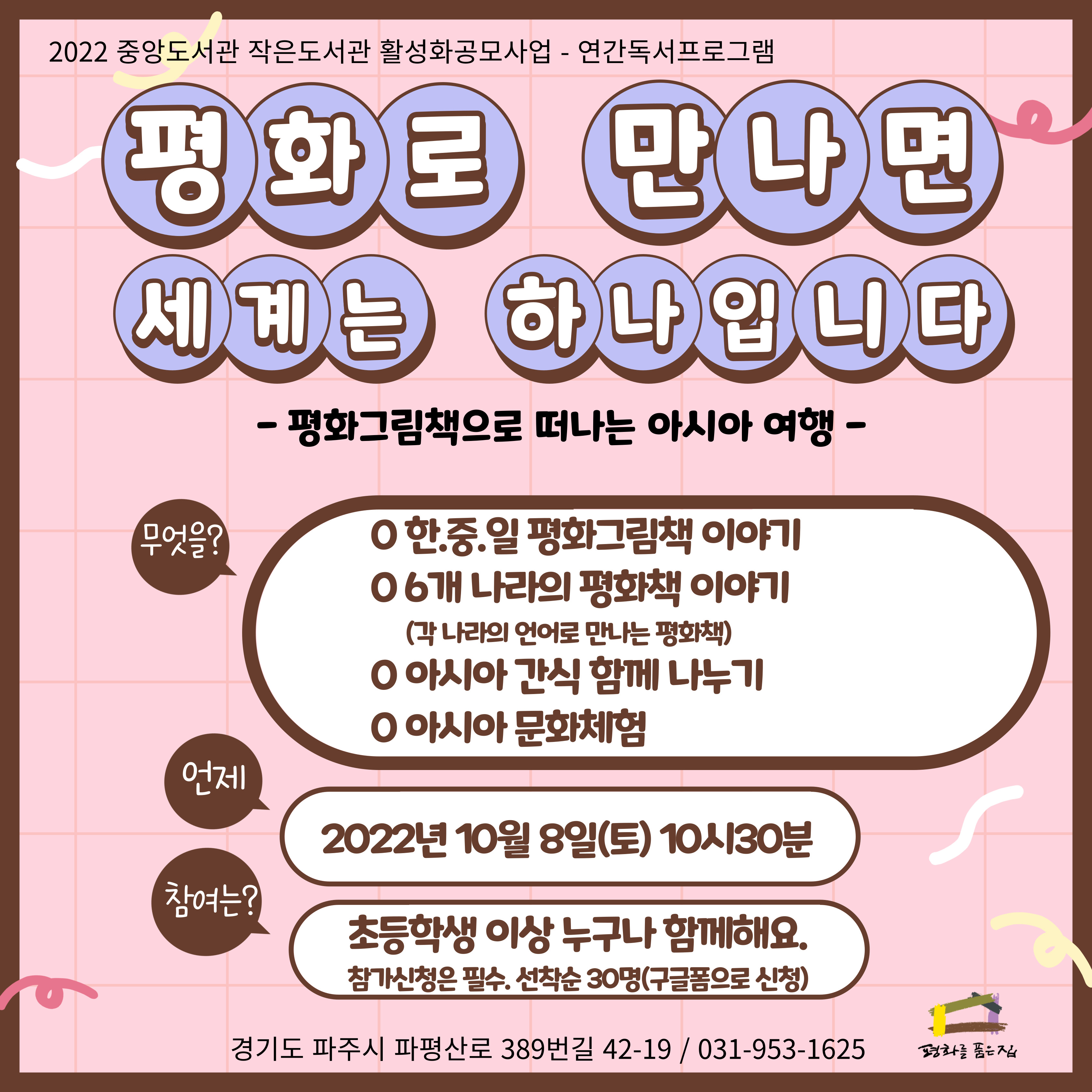 2022년 10월 8일(토) 10시 30분 평화도서관으로 가족과 함께 나들이 나오세요. 단, 프로그램 참여시, 참가신청은 필수랍니다. 참가신청