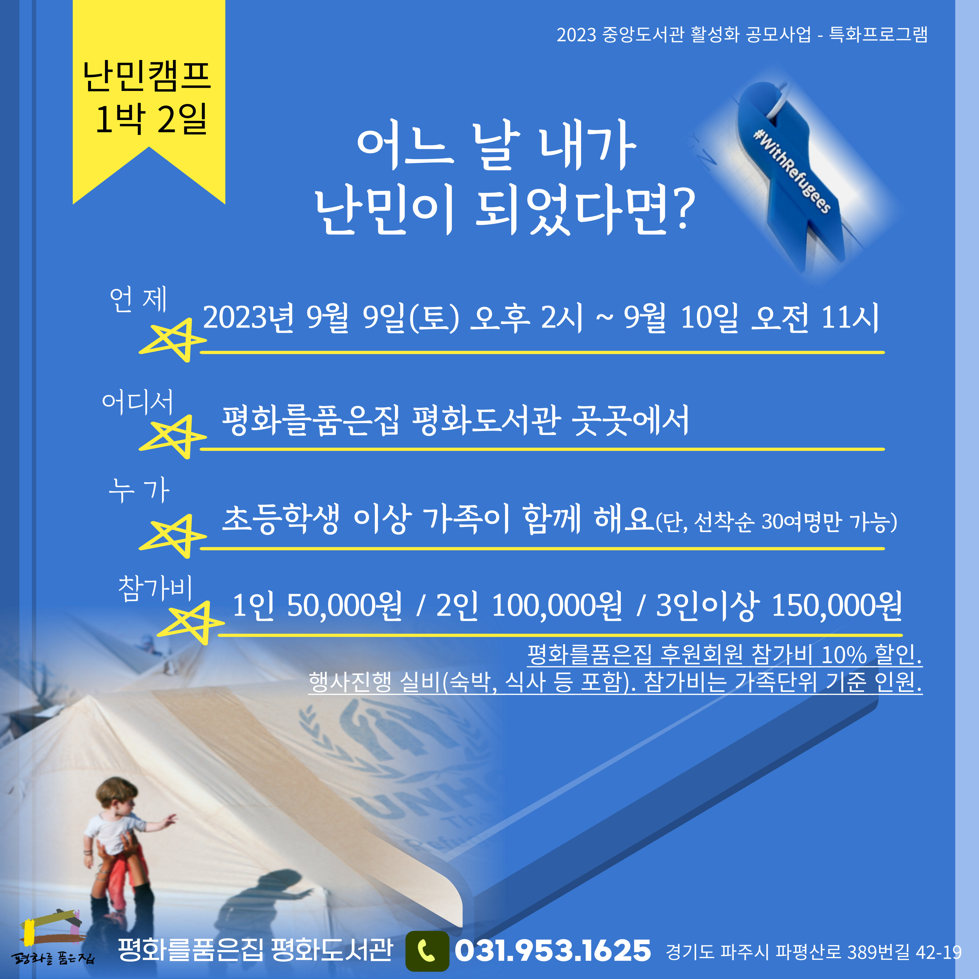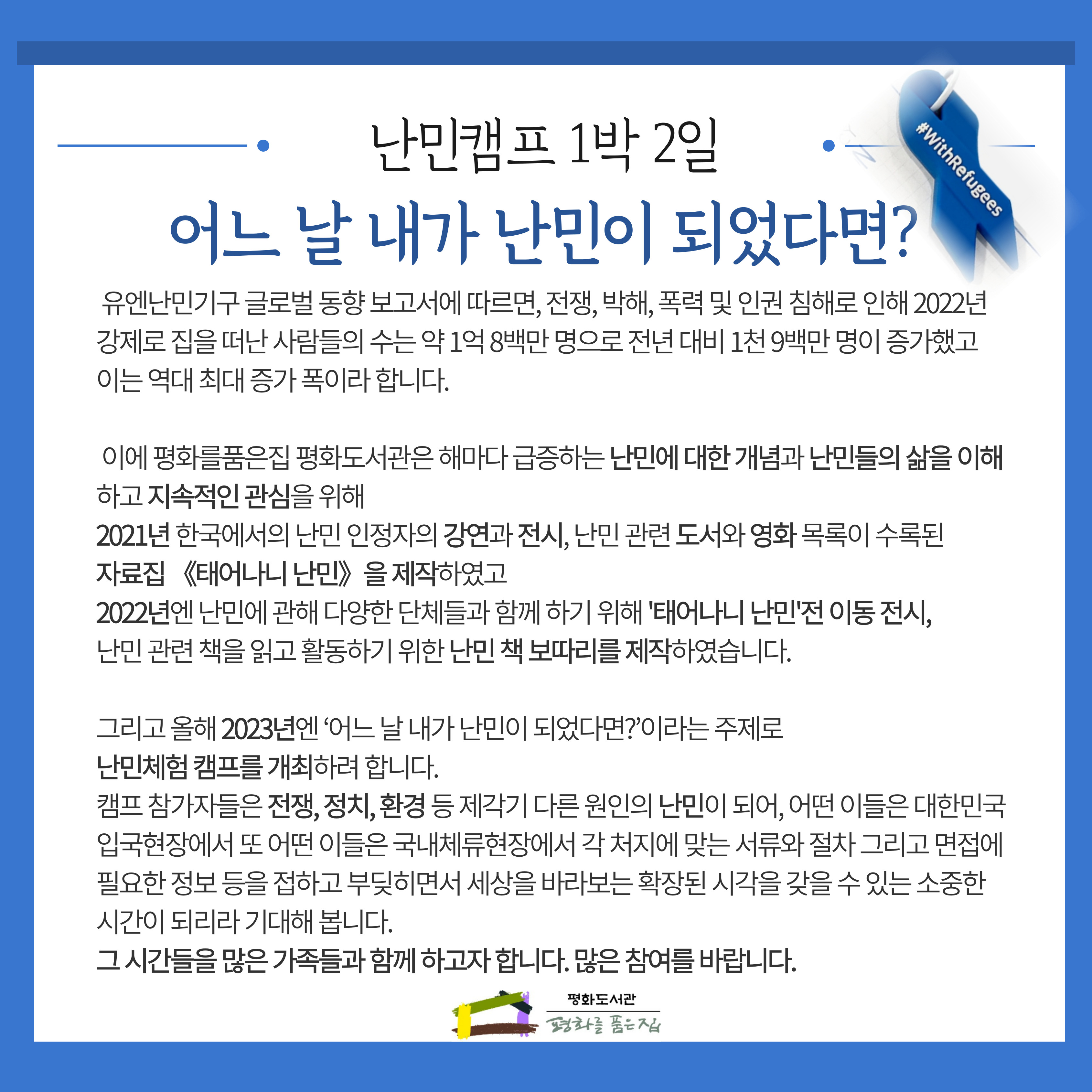 평화를품은집 평화도서관이 3년간 난민이라는 주제로 책을 모으고, 자료를 모으고, 영화를 모으고, 난민책보따리도 만들고, 이동서가도 만들었습니다. 그 대장정의 끝에난민캠프 1박 2일 '어느 날 내가 난민이 되었다면' 을 진행합니다. 가족단위로 참가하는 이번 프로그램에서 난민에 대한 많은 이야기를 함께 나누고 싶습니다. 신청은 구글폼으로 해주세요. 단 인원제한 관계로 선착순 마감입니다. 구글폼으로 신청 후 도서관에서 참가비 관련 문자를 받으시면 신청 확정이니 참가비는 그때 입금해주시면 됩니다.(후원회원에게는 참가비 10% 할인해드립니다.) 참가신청 https://forms.gle/HsAAVypAAWhtLEbR9