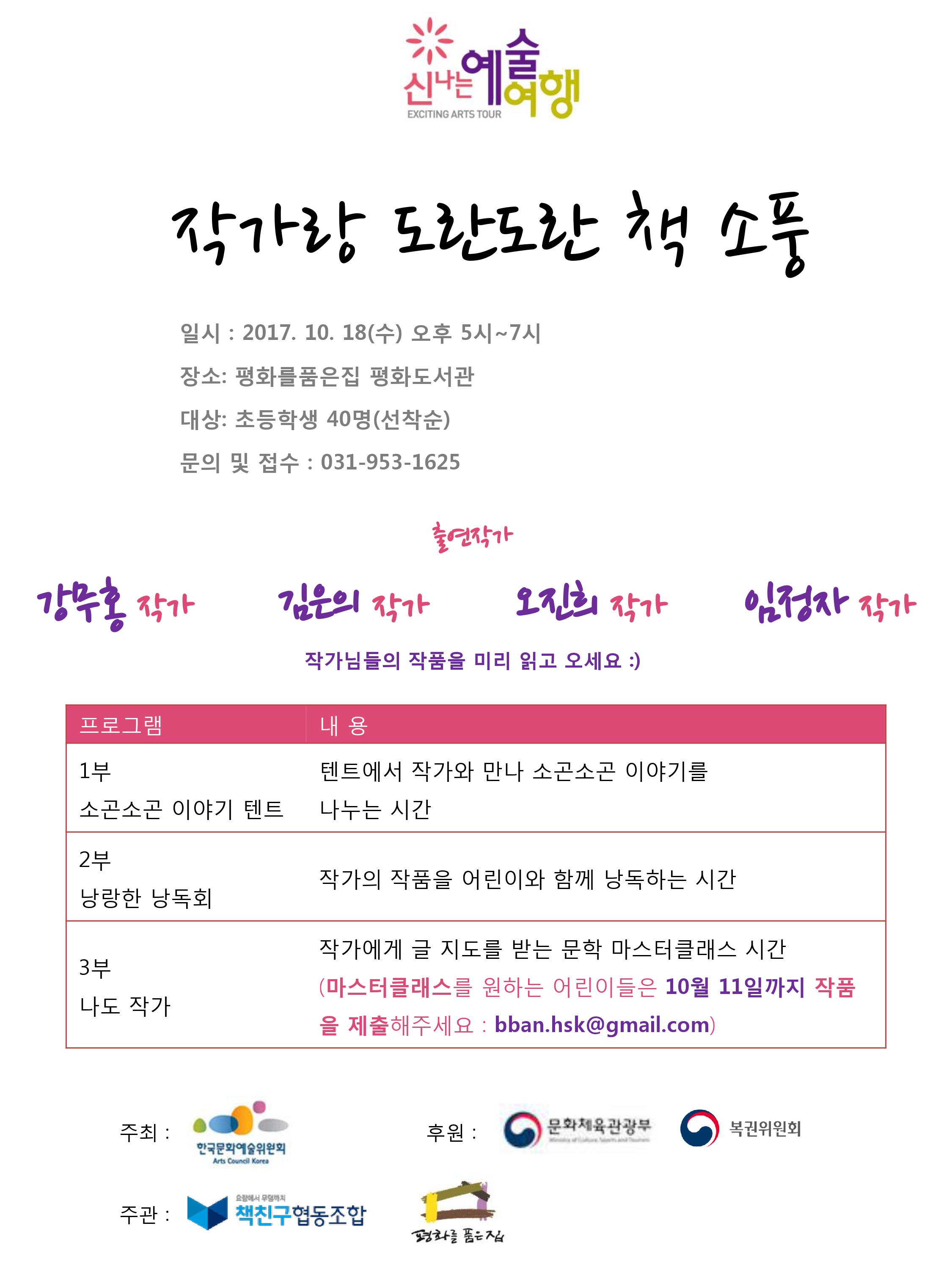 [신나는 예술 여행] 작가랑 도란도란 책 소풍 일시 : 2017. 10. 18(수) 오후 5시~7시 출연작가: 프로그램: 주최: 한국문화예술위원회 주관: 책친구협동조합, 평화를품은집 평화도서관