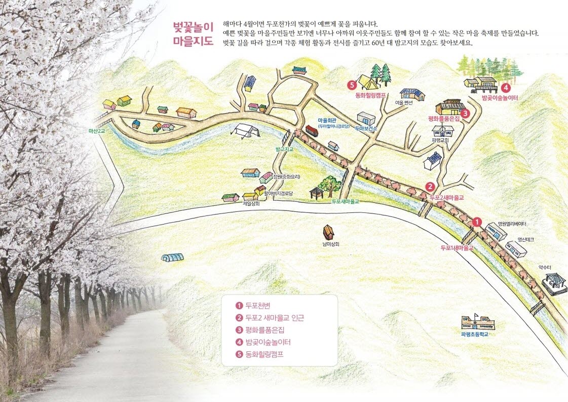 해마다 4월이면 두포천가의 벚꽃이 예쁘게 꽃을 피웁니다. 예쁜 벚꽃을 마을 주민들만 보기엔 너무나 아까워 이웃 주민들도 함께 할 수 있는 작은 마을 축제를 열었습니다. 벚꽃 길을 따라 걸으며 각종 체험 활동과 전시를 즐겨 보세요~*?