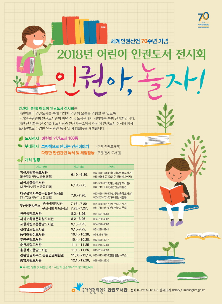 국가인권위원회 인권도서관에서 주관하는 “인권아, 놀자 ! - 어린이 인권도서 순회전시회”가 내일부터 개최됩니다. 우리 어린이들이 인권도서를 통해 인권의 다양한 모습을 접할 수 있는 전시회인데요. 특히, 올해는 세계인권선언 70주년을 맞는 뜻깊은 해라고 합니다. 오는 19일 아산시중앙도서관과 익산시립영등도서관을 시작으로 연말까지 전국 12개 도서관과 국가인권위원회 지역인권사무소 인권체험관 2곳에서 연말까지 순차적으로 열리는 <인권도서 순회전시회>에 많은 관심과 참여 부탁드려요. 자신의 소중함, 관계의 소중함, 인권의 이해, 평화, 함께 사는 세상 등 다양한 주제의 그림책과 동화 등 180종의 도서가 전시되는데, 저희 꿈교출판사(평화를품은책)의 그림책 《나무도장》, 《운동화 비행기》, 《할아버지 손》 도 선정되었습니다! 1. 《나무도장》 권윤덕 지음 평화를품은책|평화 제주4.3사건 당시 가족이 모두 학살 당한 상황에서 구사일생으로 살아남은 한 소녀의 이야기를 통한 평화와 인권 이야기입니다. 아름다운 제주도는 사람들이 가고 싶어 하는 멋진 여행 장소입니다. 그런데 그 섬은 아픈 역사를 품고 있습니다. 작가는 주인공 시리 이야기를 통해 우리에게 어리석은 역사를 더 이상 반복하지 말고 평화의 길을 찾아야 한다고 말하고 있는 듯합니다. 2. 《운동화 비행기》 홍성담 지음 평화를품은책|평화 5월 하늘에 꽃비가 내리는 풍경을 상상해 보세요. 어때요? 환상적이지요? 하지만 이 책에서 내리는 꽃비는 슬픔이고 아픔입니다. 그리고 동시에 희망이기도 합니다. 작가는 5.18민주화운동에 직접 참여했는데요, 그때 온몸으로 겪었던 일과 또 실제로 있었던 두 아이의 이야기를 이 책에 담았습니다. 친구들과 수영을 하다 까닭 없이 계엄군에게 죽임을 당한 새날이, 그 새날이의 시선을 통해 1980년 5월 광주의 모습을 만나볼 수 있습니다. 3. 《할아버지 손》 마거릿 H.메이슨 글, 플로이드 쿠퍼 그림, 서애경 옮김 꿈교출판사|차별, 편견 피부색이 다르다는 이유로 차별을 하면 될까요? 과거에 백인들은 흑인들과 같은 수영장이나 운동장, 교회, 학교 같은 공공장소를 함께 사용하지 않았어요. 심한 차별이 있었지요. 이 그림책 속 할아버지는 빵을 만드는 직업을 가지고 싶었지만, 흑인이 만든 빵은 백인들이 먹지 않는다는 차별로 빵 반죽을 할 수 없었지요. 흑인 할아버지는 손자에게 이제는 손으로 뭐든 원하는 것을 할 수 있음을 과거의 아픈 상처를 통해 알려주고 있습니다. |