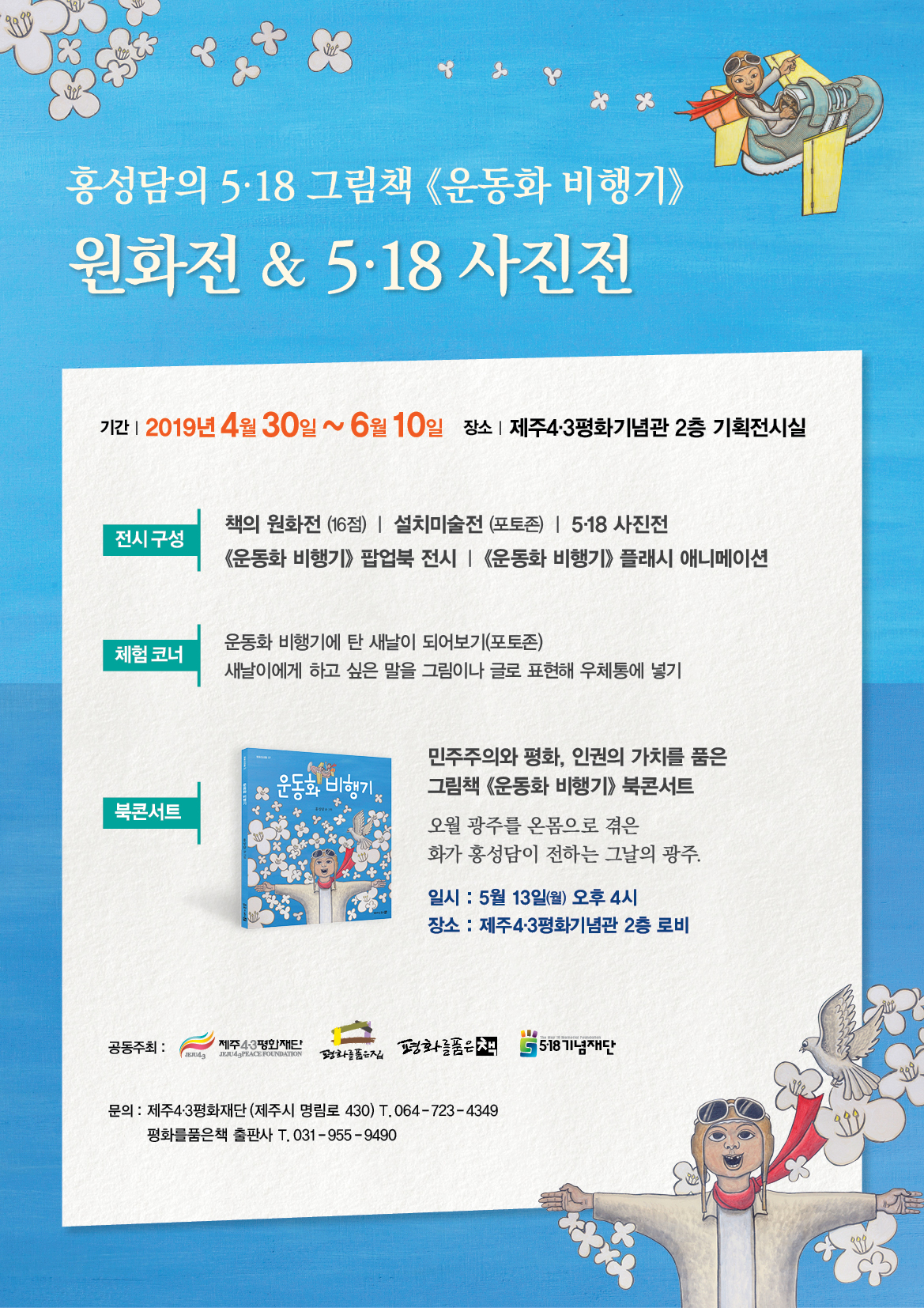 제주4·3평화재단, 평화를품은집, 평화를품은책, 5·18기념재단이 공동주최한 《운동화 비행기》 원화전 & 5·18 사진전에 여러분을 초대합니다. 오월 광주를 온몸으로 겪은 화가 홍성담이 전하는 그날의 광주 이야기 그리고 민주주의와 평화, 인권의 가치를 품은 그림책 《운동화 비행기》 북콘서트가 진행 됩니다. 또한, 다양한 전시전과 여러 체험들이 준비되어있으니 많은 참여 부탁드립니다. ^^ 일시: 2019년 4월 30일 ~ 6월 10일 장소: 제주 4·3평화기념관 문의: 제주 4·3평화재단 T. 064-723-4349, 평화를품은책 출판사 T. 031-955-9490