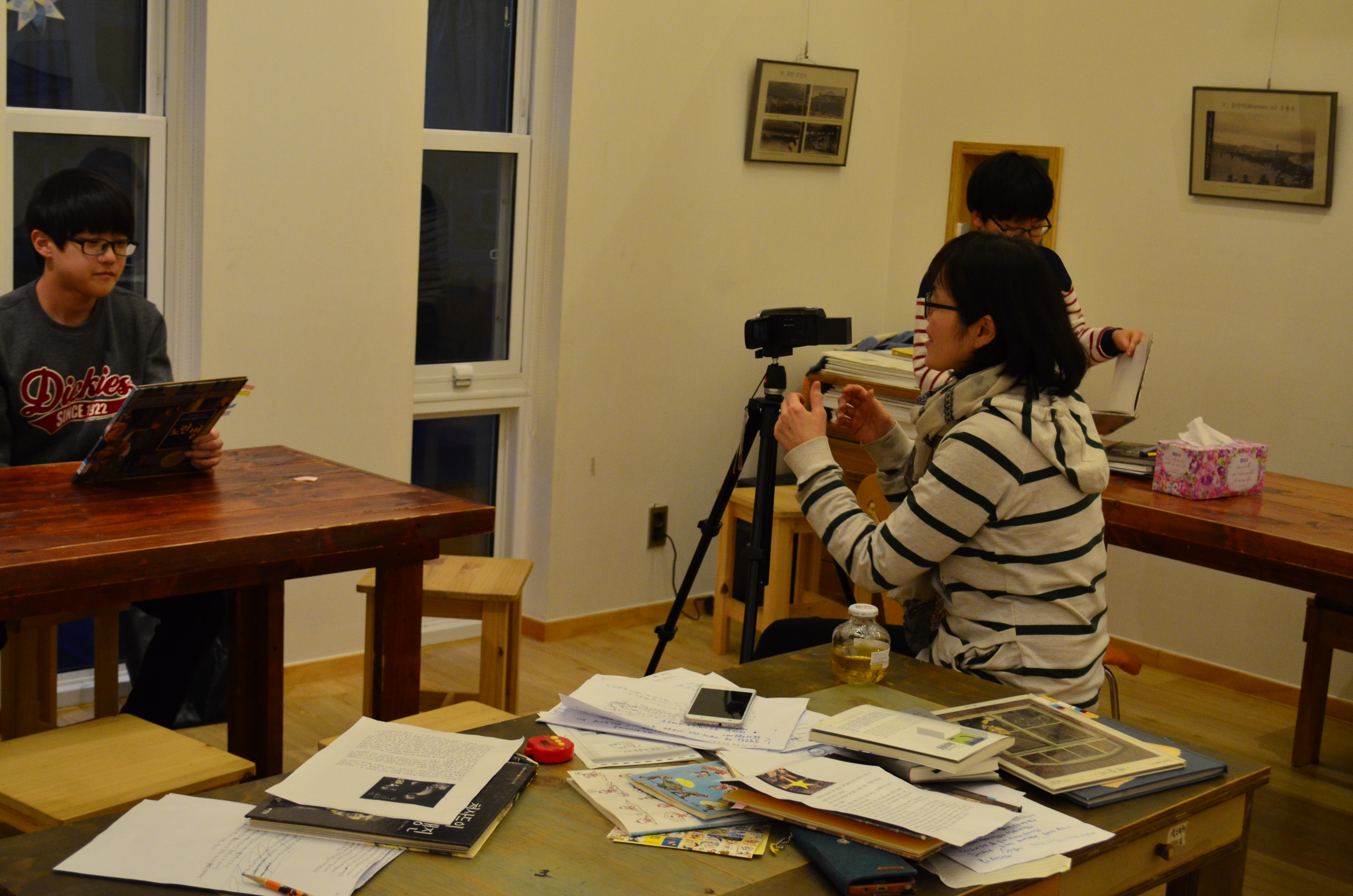 정보라는 것이 잘못 전달되면 이분법적인 판단을 내리기 쉬운데 문학을 통해 만나는 역사는 또 다른 느낌의 정리를 아이들에게 건네주었습니다. 첫날은 이렇게 작품을 함께 읽고, 건져지는 감정들을 나누고, 누구의 입장에서 이 사건을 만날지, 어떤 인물이 되어 볼지 역할을 정해서 발표하는 시간을 가졌습니다. ‘내가 만약 히틀러라면’ ‘내가 만약 독일 군이었다면’ ‘내가 창밖으로 던져진 에리카를 처음 발견한 독일 시민이었다면’ ‘내가 유대인이었다면’ 서로가 그 입장이 되어 보기 위해서 그 당시에 있었던 시대적 배경을 찾아보는 시간은 자율적으로 가졌습니다. 놀랄 만큼의 성과였습니다. 스스로의 힘으로 사건의 중심을 향해 다가가는 느낌이 들었습니다. 역사이지만 사건에 그치지 않고 그 속에서 관계와 대화를 이끌어내는 아이들의 모습이 감동이었습니다. 둘째 날은 책과 자료로 만난 홀로코스트를 영화로 만나보는 시간을 가졌습니다. 영화《줄무늬 파자마를 입은 소년》을 통하여 홀로코스트의 여러 측면을 살펴보는 시간이 되었습니다. 유대인과 나치 사상의 교육을 받은 독일 시민과 그 상황을 둘러싼 모든 것에 아이들은 편협하지 않는 시선으로 사건을 들여다보았습니다. 영화를 보고나서 우리는 어떤 방법으로 우리가 만난 “홀로코스트”를 전달할지 방법을 고민하기 시작했습니다. 텔레비전 프로그램 속에 “문학으로 만나는 역사”라는 제목으로 각자가 감명 깊게 읽은 책을 소개하는 방식으로 만들어 보기로 했습니다. 각자가 책을 고르고 소개 글을 쓰고 , 그 글을 바탕으로 방송을 만들었습니다. 영상 작업을 밤새 해 주신 양은영 선생님께 다시 한 번 감사의 말씀 드립니다 아이들은 어른들이 자칫 놓치는 부분까지 잘 읽어냈습니다. 다시 한 번 아이들의 에너지를 느낀 귀한 시간이었습니다
